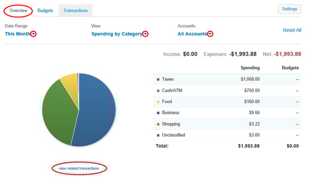The Overview tab shows spending by category over a specific date range. The default view is to view spending amounts This Month, by Category, and from All Accounts. Hover over the pie chart to see how much you’ve spent in that category. You can also click “view related transactions” to see a list of transactions from the specified date range and accounts.